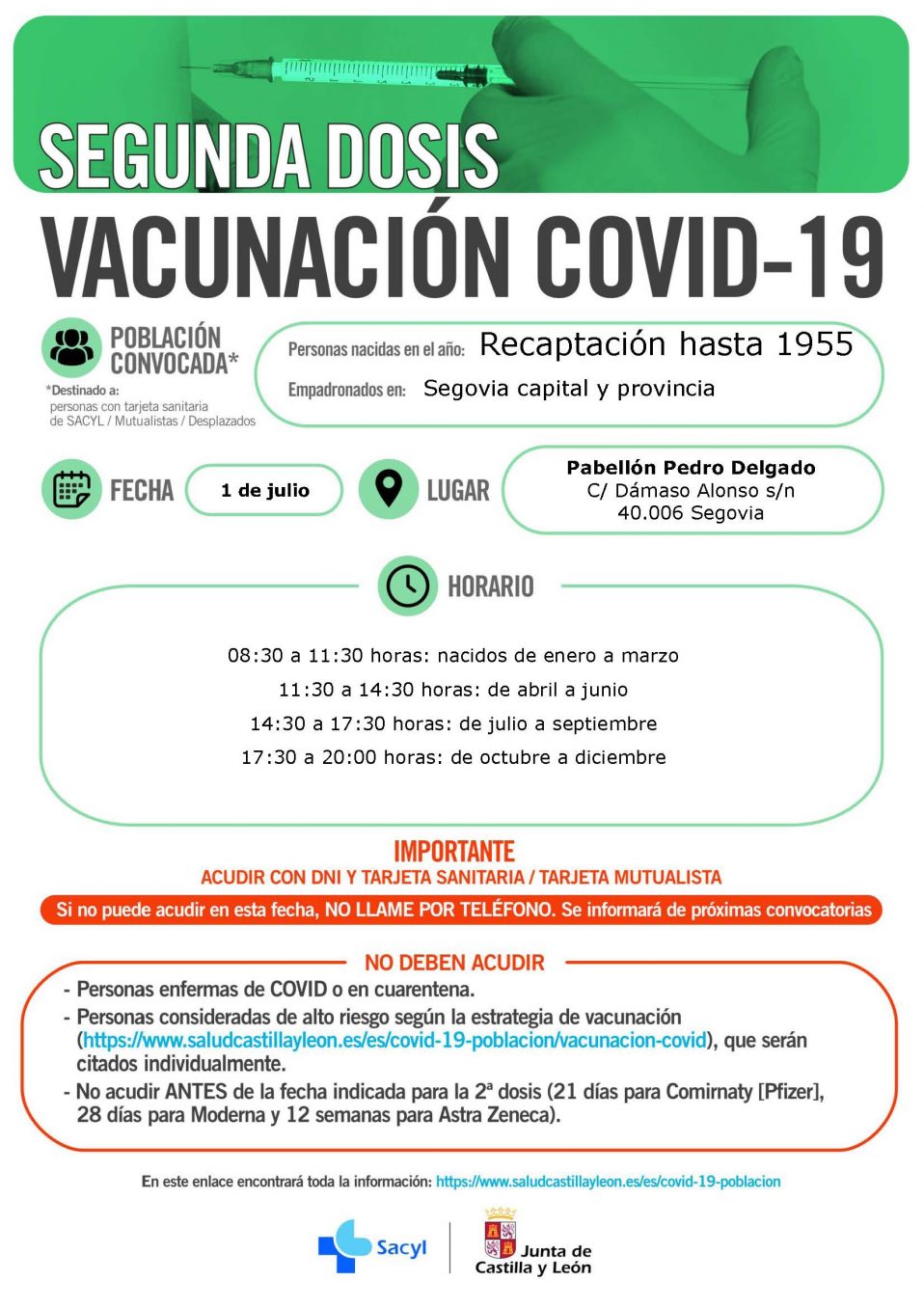 Vacunación Covid-19: Segunda dosis recaptación personas nacidas antes de 1955. En el Pabellón Pedro Delgado conforme al siguiente horario: Jueves 1 de Julio 08:30 a 11:30 horas: nacidos de enero a marzo 11:30 a…